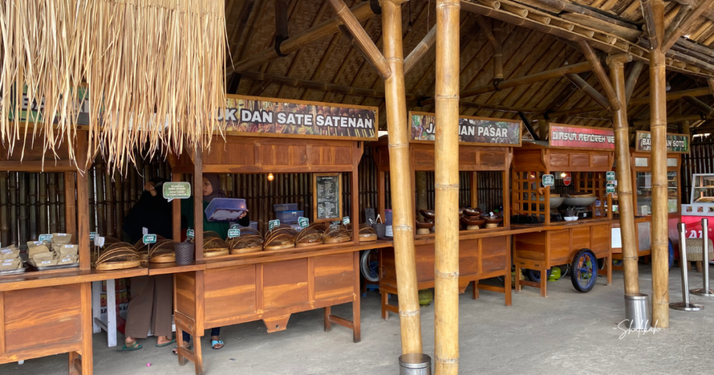 Aneka masakan khas Yogya hingga camilan umum tersusun di dalam gerobak-gerobak yang diatur sedemikian rupa. Pengunjung bisa langsung memilih makanan yang ingin mereka sukai. Mulai dari nasi kucing, aneka sate, jajanan pasar, dimsum, hingga masakan sejuta umat seperti ayam goreng pun tersedia di sini. Tak lupa aneka minuman dan hidangan pencuci mulut seperti es doger ikut meramaikan tempat ini.